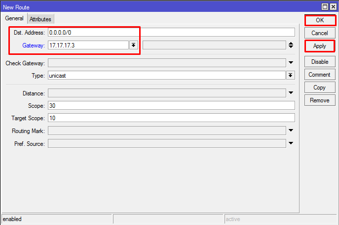 - Jika sudah masuk ke menu IP > Routes, Pengaturan ini digunakan agar kita bisa Ping ke Client.